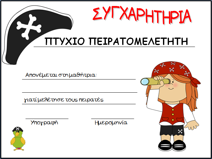 Στην παρακάτω διεύθυνση θα βρείτε ιδέες για καπέλο, κιάλια, γάντζο, σεντούκι, χάρτη θησαυρού και θησαυρό! https://craftsandartforchildren.blogspot.gr/2010/09/pirate-crafts-and-treasure-hunt.html .